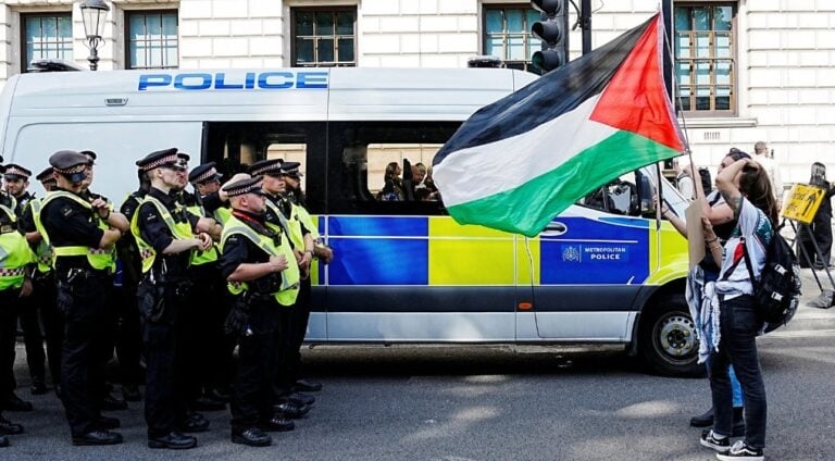 Sute de persoane au participat la protestul de lângă Parlamentul britanic, multe purtând pancarte cu mesaje de condamnare a operațiunilor militare. Forțele de ordine au intervenit pentru a dispersa asamblarea, reținând participanți sub acuzația de susținere a unei organizații interzise, agresiune și încălcarea liniștii publice.